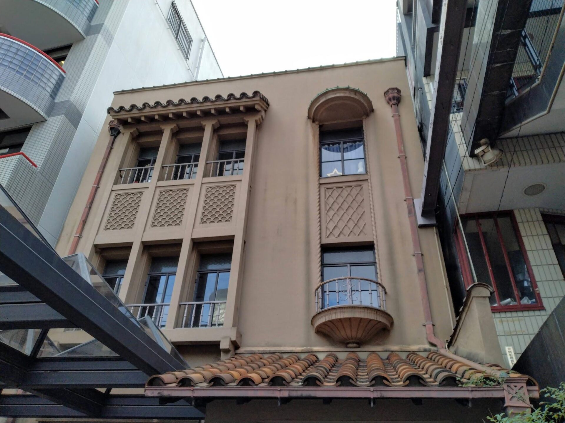 外観は、赤い瓦屋根や半円形のバルコニーが目を引くスパニッシュ様式を基調としている。しかし細部を見ると、日本の伝統的な「青海波」の模様や、寺社の建築に見られる「肘木」のような装飾が施されており、東洋と西洋が見事に融合している。内部は、大阪の町家特有の「鰻の寝床」状の奥行きを持ちながらも、竣工当時から全館暖房や水洗トイレを備えるという、当時の最先端を行く文化住宅であった。