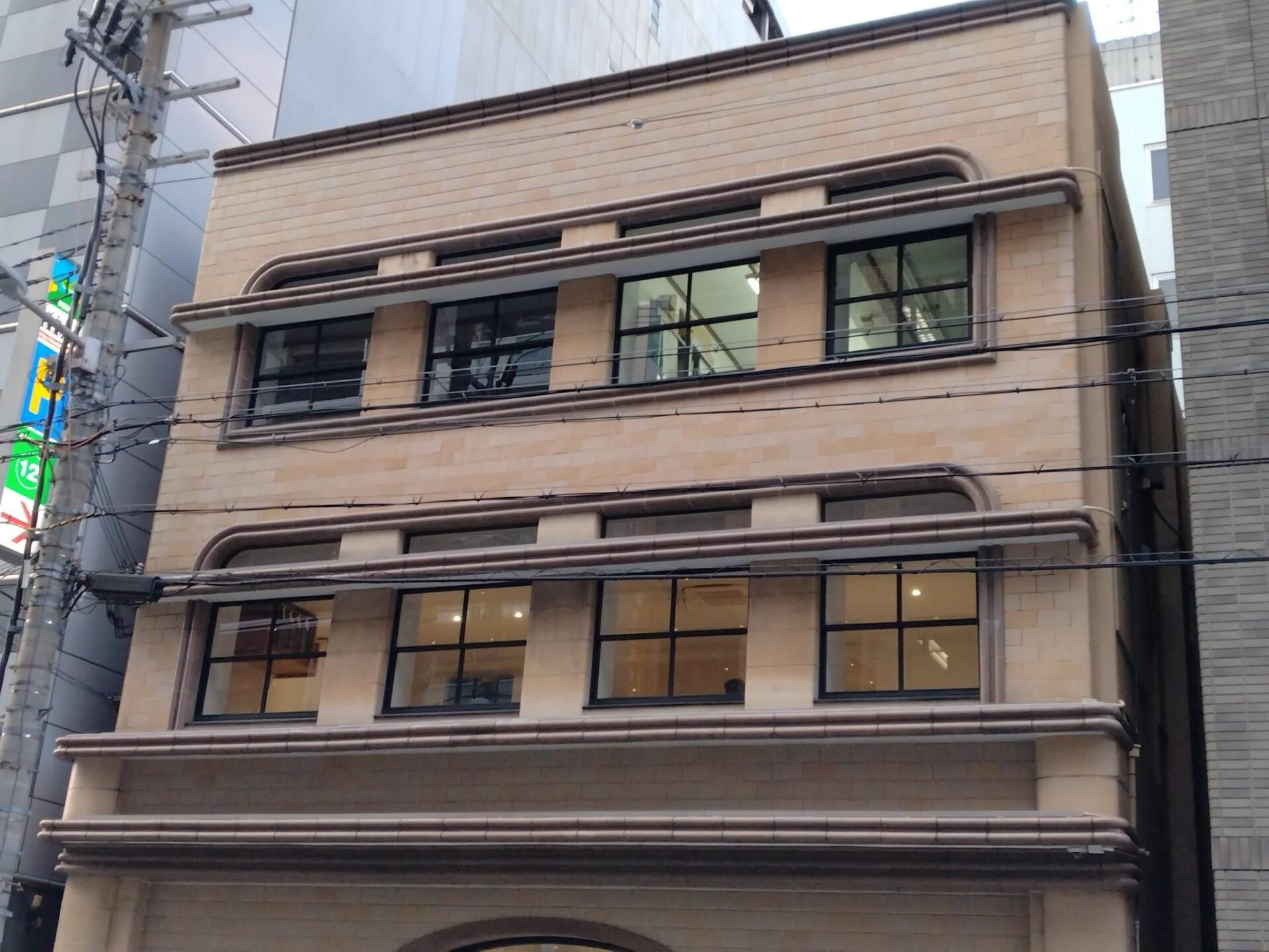 この建物は昭和5年に建設されたとされ、戦前の商業建築らしい堅実で品格ある意匠を今に伝えている。外観は左右のバランスを重視した構成で、装飾を抑えながらも壁面の陰影や横のラインを強調することで、落ち着いた重厚感を生み出し、アールデコ様式で全体をまとめたレトロモダンな佇まいである。香料という目に見えない価値を扱う企業の社屋として、華美ではないが信頼性を感じさせる。