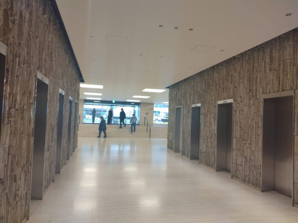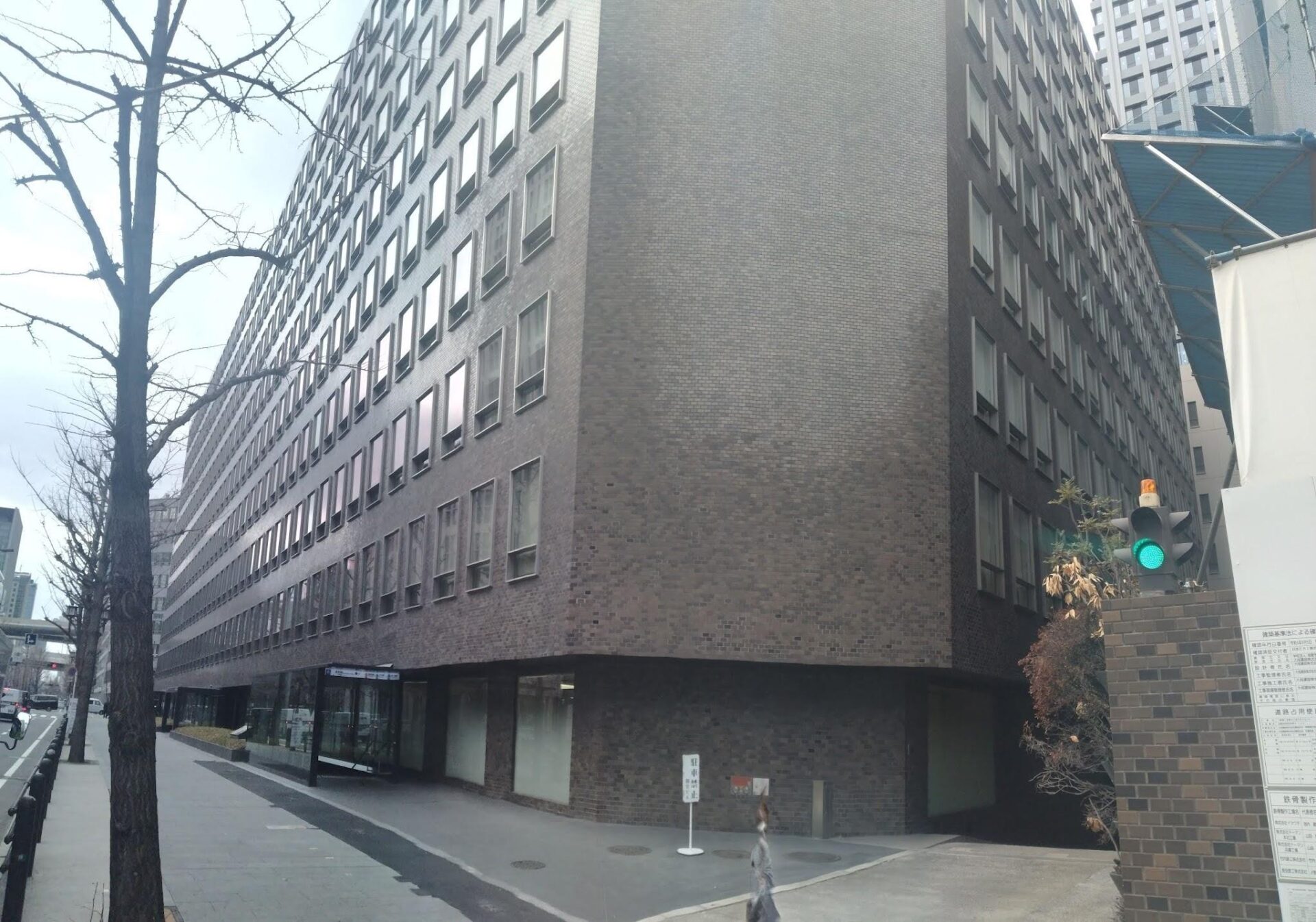 外装には茶褐色のタイルが用いられ、遠目には都市的で端正な表情を見せつつ、近づくと手触り感のある細やかな質感が感じられる。モダンでありながらどこか日本的な落ち着きを備えている点が、このビルの大きな魅力である。