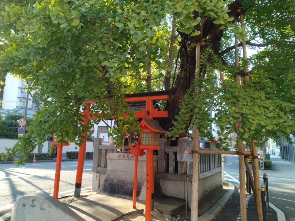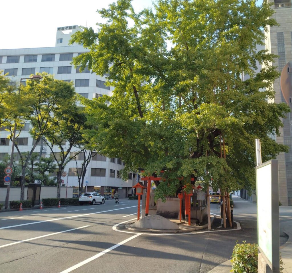 梅田の繁華街からやや東、ライフ太融寺店の目の前の通りにお社と大木がある。この一帯は元々「太融寺」の境内であり、現在は飛地のような形でお社が道路上に祀られている。