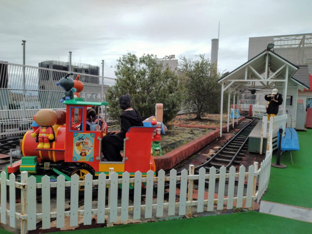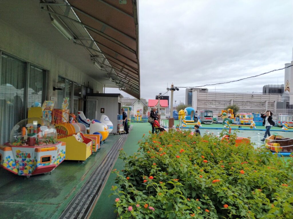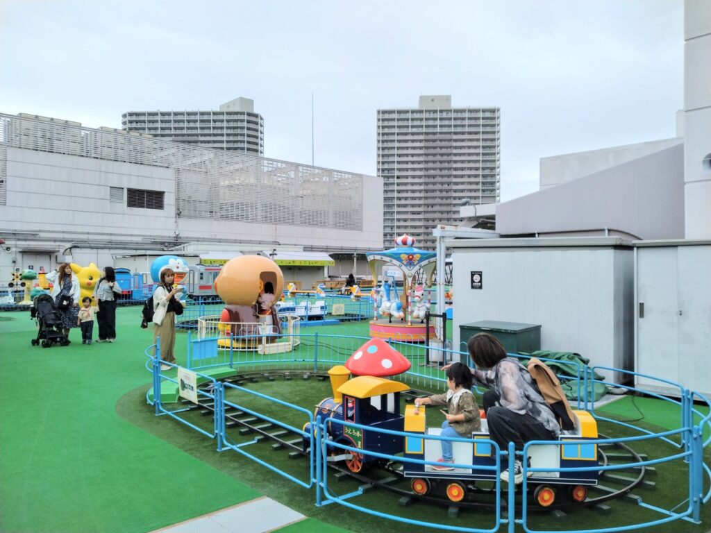 線路を走る機関車型乗り物やゴーカート、ショベルカー型の遊具など、多様なアトラクションを備えており、屋上のほぼ全面を使った広いエリアが魅力だ。昭和の懐かしい雰囲気のある乗り物や色合いで、どこを撮っても絵になる、ノスタルジックな空間である。
