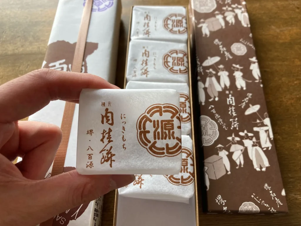 時を経て、上方文化が花開いた元禄の太平の時代。宗源の子孫は、再び堺の地に菓子商を開く。先祖の名を継ぎ「八百源」と称した。家伝として伝わっていた肉桂餅を、初代は柔らかな求肥に肉桂を練り混ぜ、小豆のこし餡を包むという、新たな製法で世に送り出す。この新しさが評判を呼び、肉桂餅は時代と共に堺の町衆に愛される銘菓となっていった。